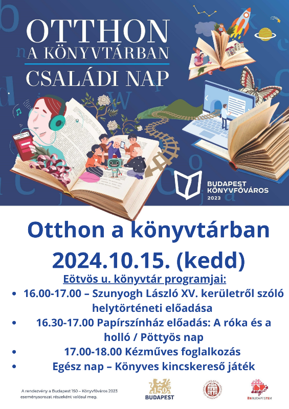 2024. október 15-én, kedden az Eötvös utcai tagkönyvtár változatos programokkal ünnepli a családi napot, ami egyben a Fővárosi Szabó Ervin Könyvtár 120. születésnapja is. A felnőttek a kerület történetét ismerhetik meg Szunyogh László, történész előadásában, míg a kicsiket papírszínház és kézműves foglalkozás várja. Továbbá ezen a napon az egész éves beiratkozásra 50 %-os kedvezményt biztosítanak. A megbocsátás napját is ezen a napon rendezi a könyvtár.